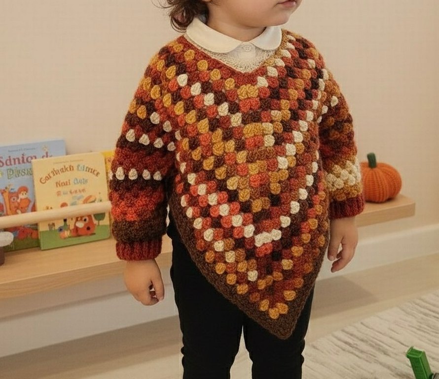 Kız çocuk ponço, bol kesim, uzun kollu ve yuvarlak yaka. Koyu kahverengi ve sıcak tonlarda desenli örgü, bohem tarzına uygun. 3.5/4 yaşa uygundur. kendi örgüm. Hiç kullanılmadı.