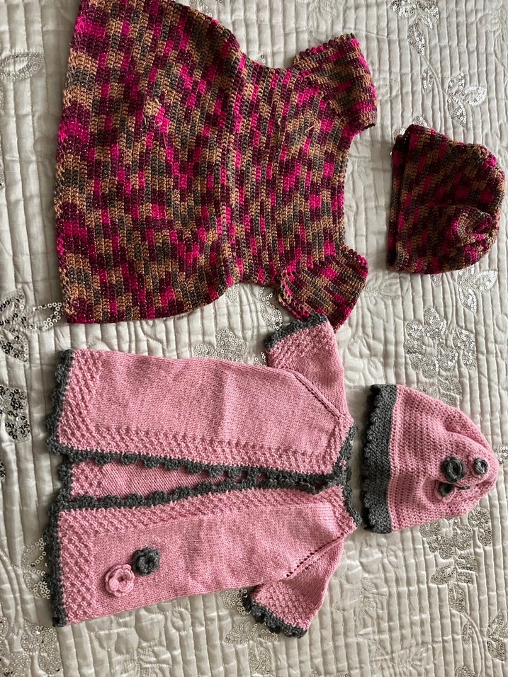 Koyu pembe ve kahverengi bohem tarzında fitted kesim, kolsuz örgü yelek ile açık pembe kenarları koyu renk detaylı hırka ve şapka seti.