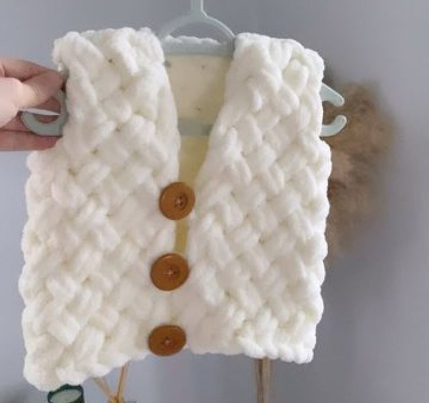 Kız çocukları için puffy beyaz örgü yelek, düğmeli ve yakalıdır. Bohem tarzda, yumuşak dokulu ve kolsuz tasarımdır.