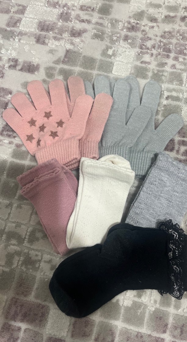 Gri ve pudra renkli, örgü kız çocuk eldiveni. Rahat ve sıcak tutan yumuşak kumaştan üretilmiştir. 4 adet renkli çorap. Sıfır ayarındadır..4-5-6 yaş uyumludur.