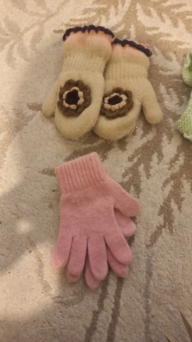 Pastel bej ve pembe renklerde kız çocuk örgü eldivenler. Bir çift çiçekli örgü detaylı, diğeri düz ve lastikli. Yumuşak örgü kumaş, serin günler için.