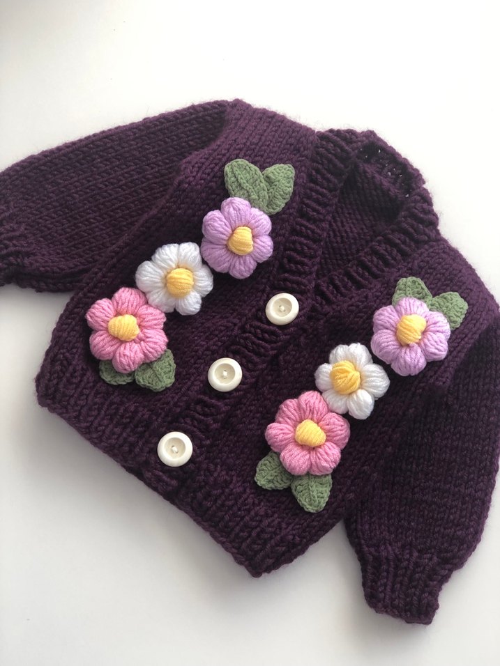 Mor renkte, uzun kollu ve bohem tarzda, renkli nakışlı çiçek detaylarıyla kız çocuk örgü hırka. Alize maxi ipi ile örülmüştür .boyu 30 cm eni 27 cm dir .0-6 ay arasına uygundur .