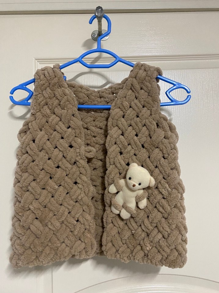Kahverengi örgü kız çocuk süveter, bisiklet yaka ve dar kesim. Yumuşak dokulu, küçük oyuncak ayı detaylı Yelek+atkı set .