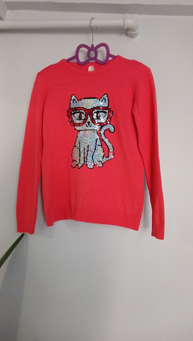 Kırmızı örgü kazakta önünde gözlüklü renkli baskılı kedi deseni bulunur. Yuvarlak yaka ve uzun kolludur, dar kesimdir.