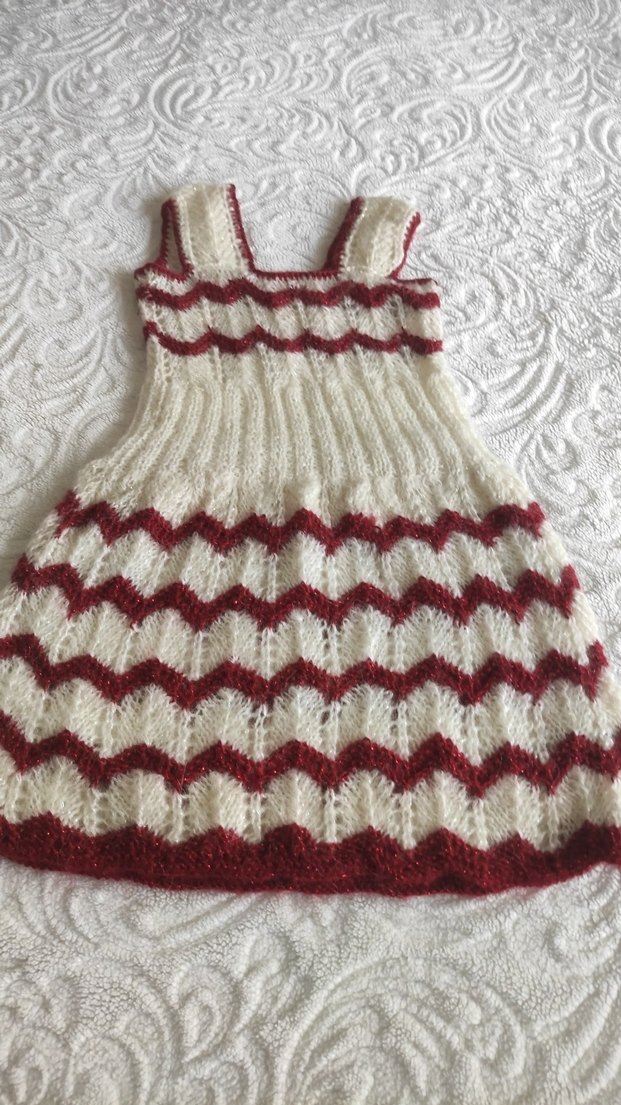 Kolsuz, tekne yaka, örgü dokulu beyaz ve bordo zigzag desenli, bohem tarzda kız çocuk elbisesi. İnce örgü kumaştan, retro görünüm sunar.