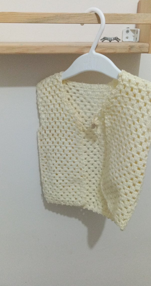 Kolsuz, gevşek kesim ve yuvarlak yakalı örgü yelek. Düz, pastel beyaz renkte ve bohem tarzda.