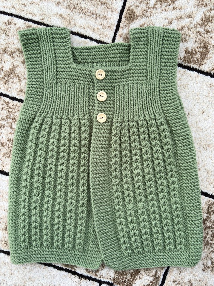 Kız çocukları için yumuşak örgüden yapılmış, bol kesim ve kolsuz tasarıma sahip yeşil yelek. İki koltuk altı arası mesafe:26 Boy:37