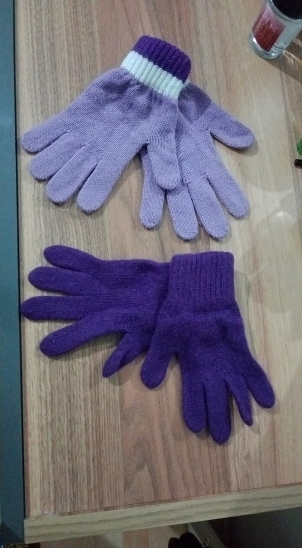 Bu set, yumuşak ve sıcak tüylü kumaştan yapılmış, kız çocuklar için iki çift örgü mor eldiven içerir. Bir çift açık mor ve çizgili manşetli, diğer çift düz koyu mor renktedir.