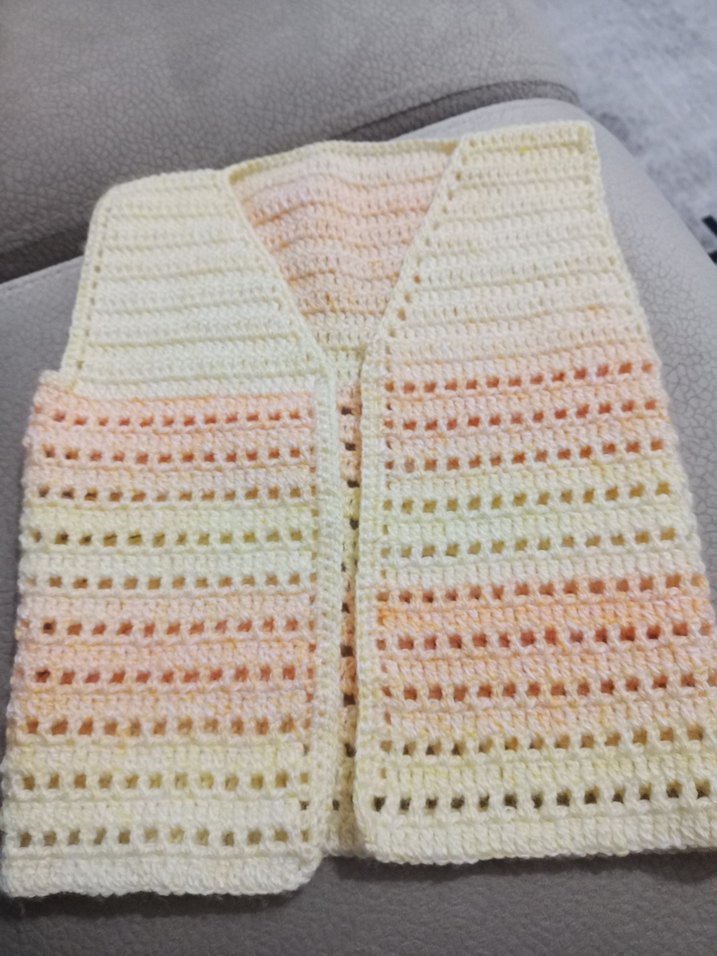 Kız çocukları için pastel çok renkli, örme kumaştan yapılmış, salaş kesim ve tekne yaka, kolsuz yelek.