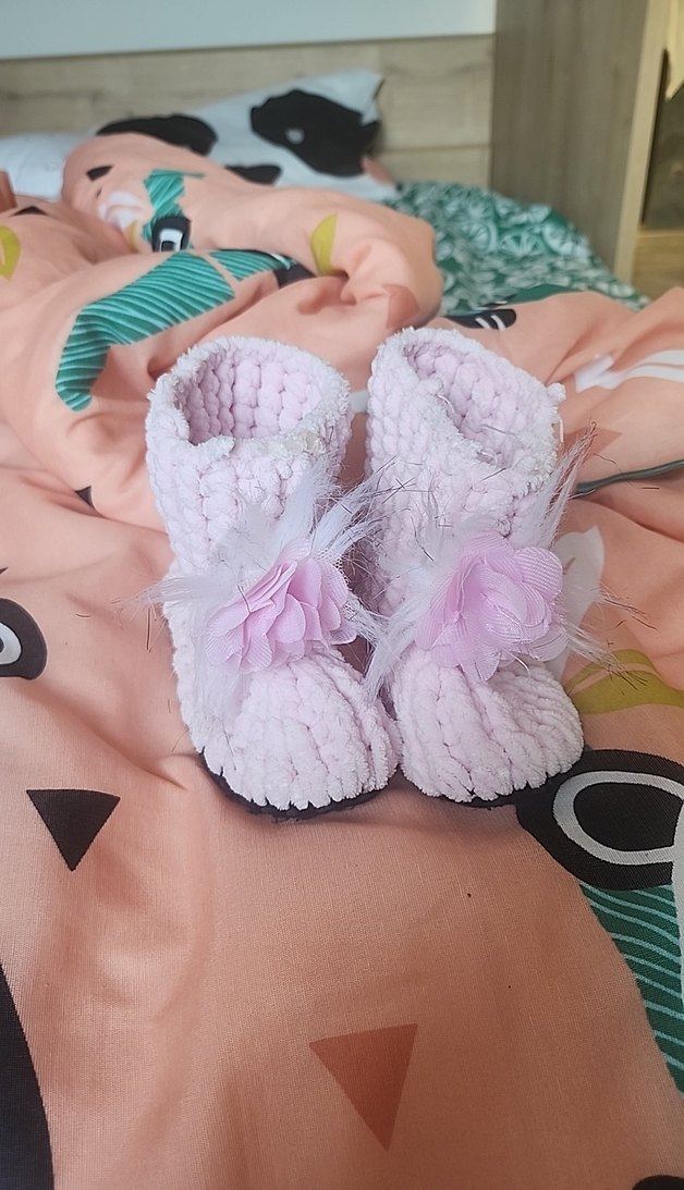 Pembe örgü kız çocuk ev botu, işlemeli çiçek detayları ve yumuşak dokusu ile bohem tarzı sunar. alacak olan pişman olmaz şimdiden güle güle kullanılsın.