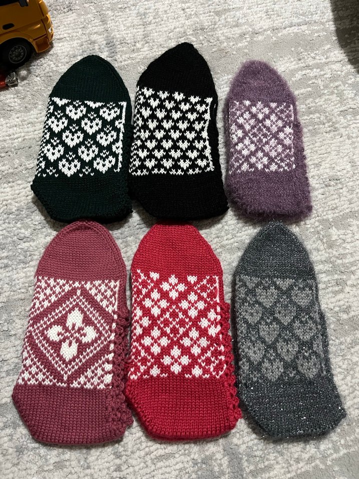 Örgü kız çocuk ev terlikleri, işlemeli desenlerle koyu ve çok renkli. Geleneksel tarzda, sıcak ve rahat kullanım sunar.
