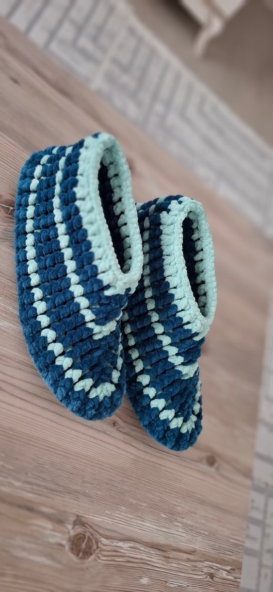 Kız çocuklar için örgü, mavi sıcak terlikler. Bohem tarzda, yumuşak örgü kumaştan konforlu ev kullanımı için uygundur.