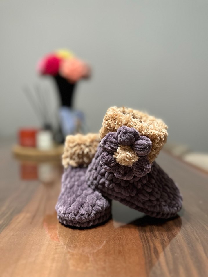 Kız çocukları için örme, yumuşak dokulu sıcak ev terliği. Kıvrımlı manşet ve çiçek detaylıdır. Kahverengi ve gri tonlarındadır. 19-20 no