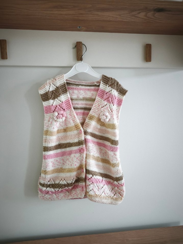 Kız çocukları için pastel pembe tonlarda, çiçek detaylı, bol kesim, V yaka ve kolsuz örgü bohem yelek.