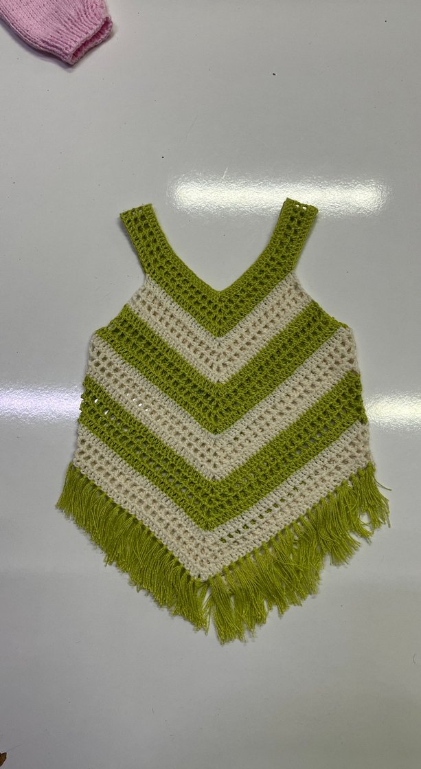 Kız çocuk için V yakalı, örgü, kolsuz, bol kesim bluz. Açık haki ve krem renkli çizgiler ve püskül detayları içerir.