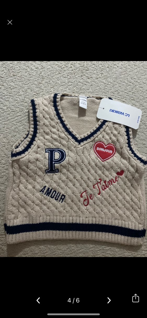 Örgü, kolsuz, bol kesim süveter. V yaka ve "AMOUR" ile "Je T'aime" yazılı desenler içerir.