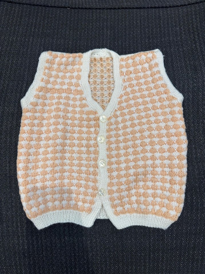 Kız çocukları için örme, kolsuz, V yaka yelek. Pastel renklerde, düğmeli ve bol kesimdir. Yumuşak örgü kumaştan yapılmıştır.