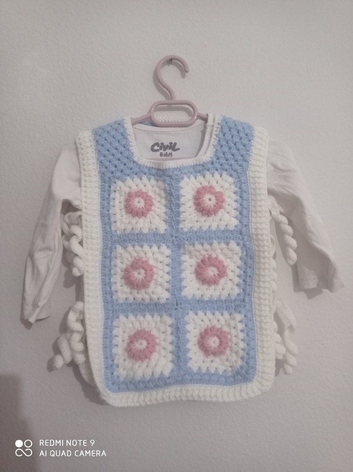 Kolsuz, bol kesim ve yuvarlak yakalı bu örgü yelek, el yapımı yandan bağlamalı istenilen renk ve yaş yapılır