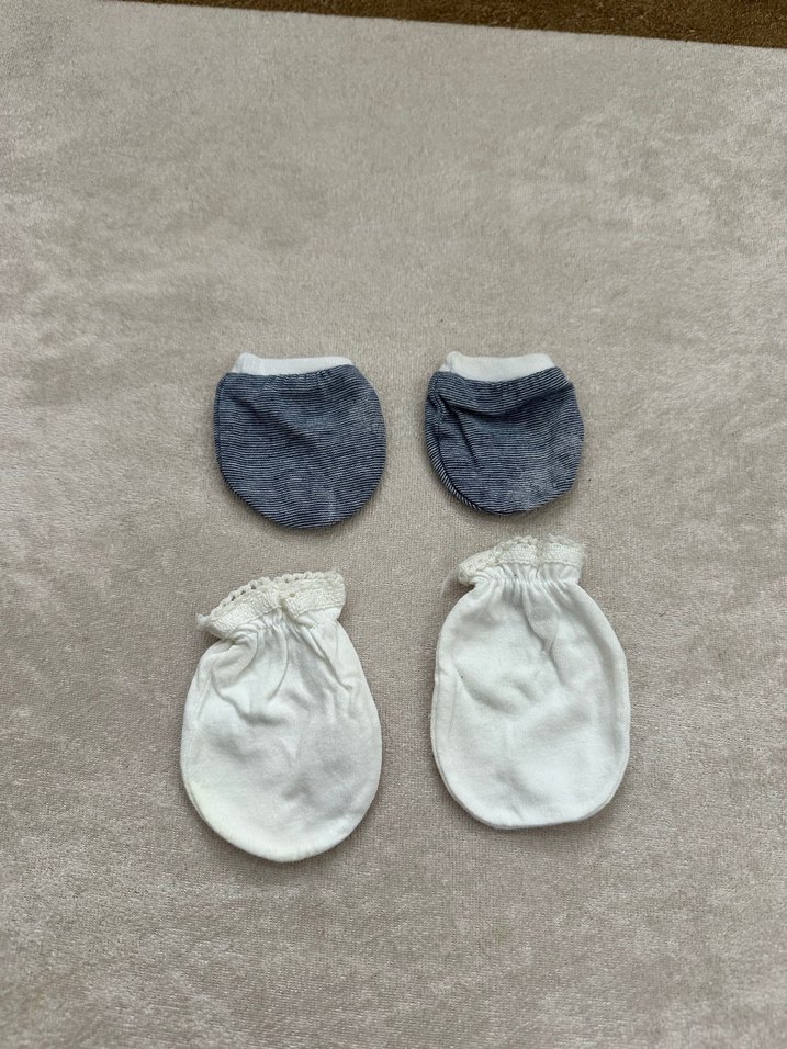 Beyaz ve gri renkte, örme pamuk kumaştan yapılmış sade kız çocuk eldiven seti, normcore tarzda. #bebek #eldiven #giyim (1.ç)