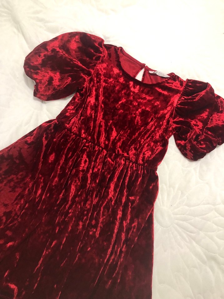 Kırmızı kadife kumaştan, kısa balon kollu, yuvarlak yaka Parlak kumaş almanyadan hediye geldi sadece yıkadım dolaba kaldırdım kolları balon belden lastikli parlak kadife yılbaşı veya özel günler için uygun ♥️
