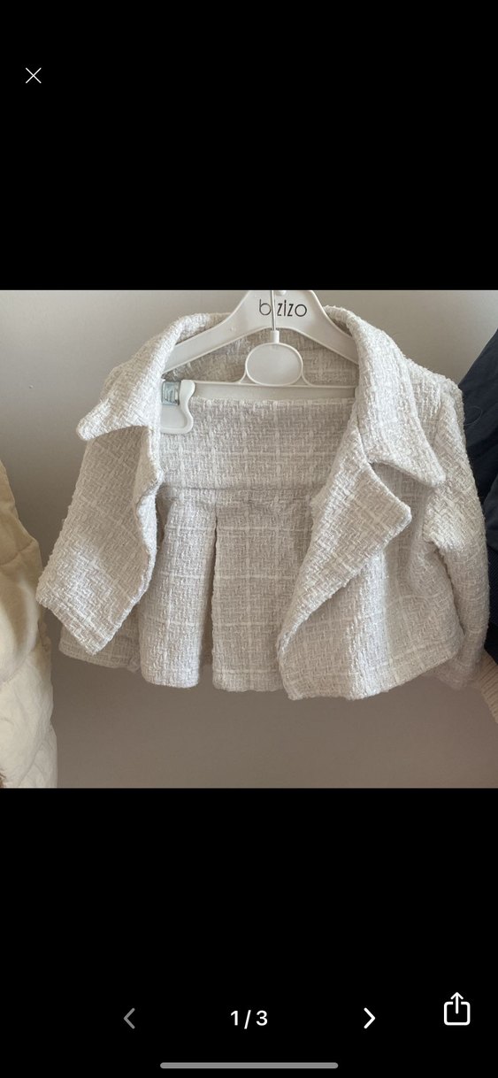 Beyaz renkli, triko dokulu, keten kumaştan kız çocuk bolero. Uzun kollu, geniş kesim ve yakalı, desen içermeyen sokak stili parçası. 1-1,5 yaş için uygundur