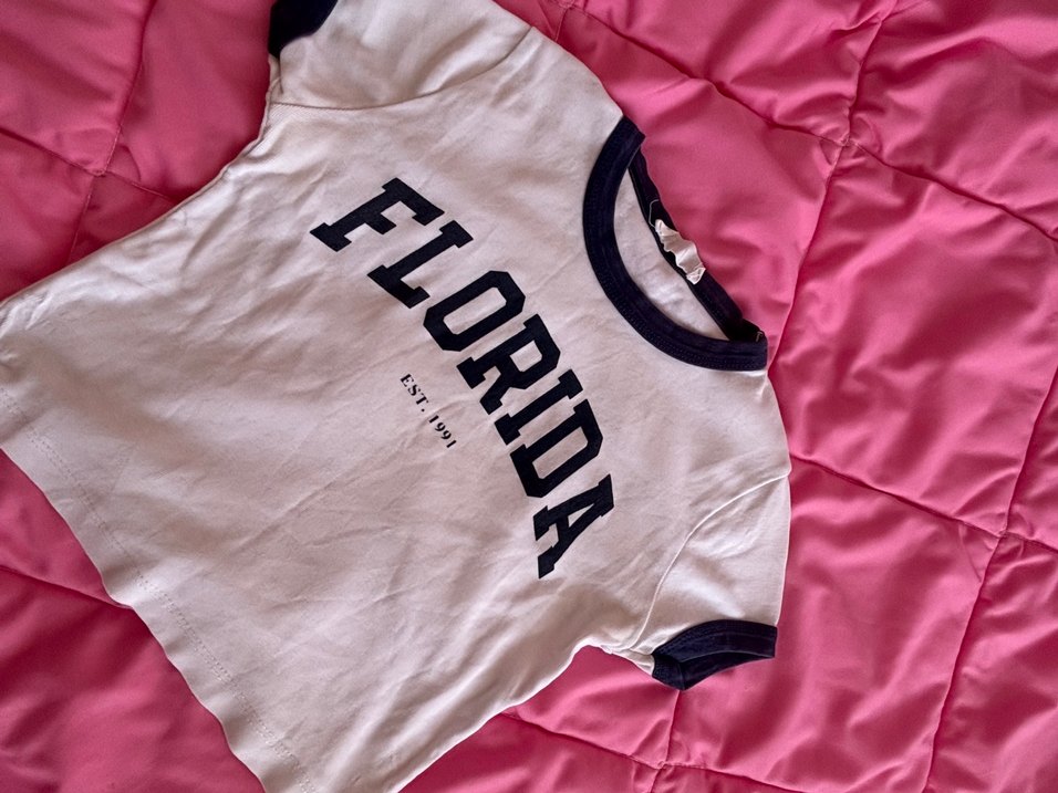 Kısa kollu, pamuklu ve fitted kesim kız çocuk tişörtü. Üzerinde 'FLORIDA' baskısı bulunan pastel pembe tonlarında rahat bir tişört.