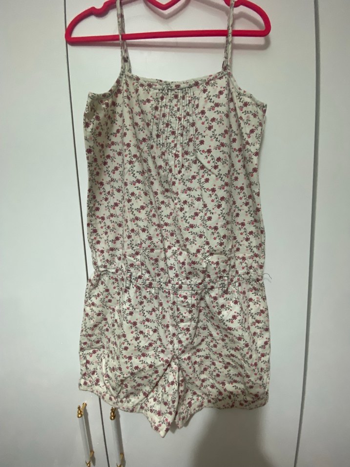 Pamuklu, askılı ve bol kesim tulum, bohem tarzında çiçek desenlerine sahip.