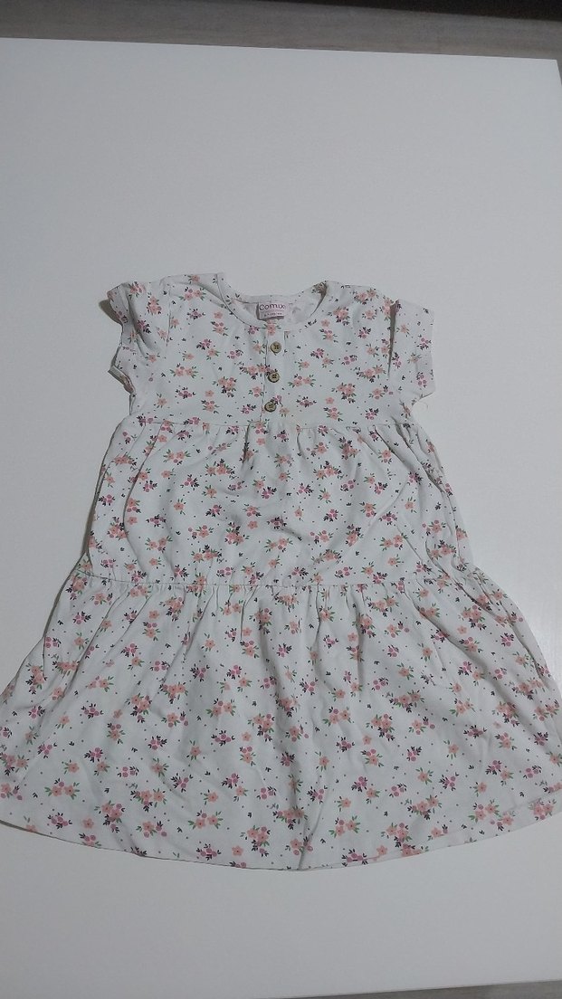 Pamuklu, kısa kollu, düğmeli ve bol kesim kız çocuk elbisesi. Beyaz zemin üzerine pastel renkli çiçek desenleri ve bohem tarzı ile dikkat çekiyor.
