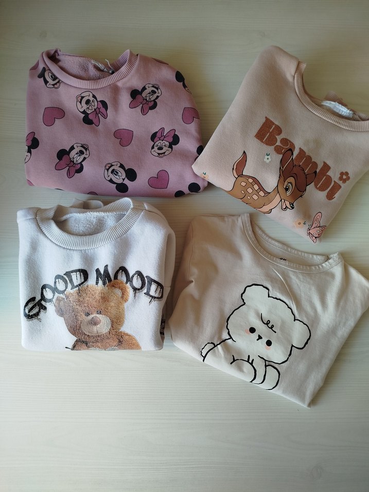 Pamuklu, uzun kollu kız çocuk sweatshirtleri, yuvarlak yakalı ve bol kesimdir. Pastel renklerde, eğlenceli baskılar içerir, günlük kullanım için uygundur. Önlerinde hafif lekeri mevcut Bej rengi ince digerleri kalındır 5-6 yaştır