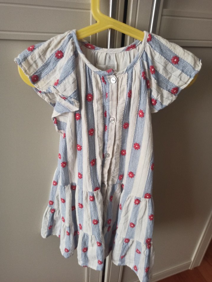 Kız çocukları için pamuklu, bol kesim elbise. Kısa fırfırlı kollu, düğmeli ön detaylı. Gri-beyaz çizgili ve kırmızı çiçek desenli. Rahat ve ferah.