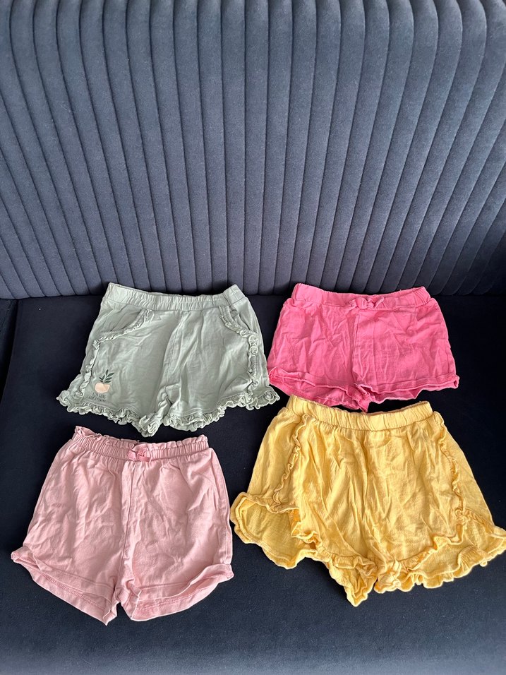 Kız çocukları için pastel renklerde, pamuklu kumaştan, bol kesim ve fırfırlı detaylara sahip şortlar. Desensiz ve sade tasarım.
