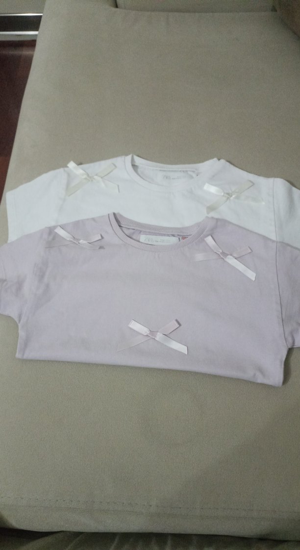 Yumuşak pamuktan üretilmiş, kısa kollu ve bisiklet yaka, pastel beyaz ve açık mor renklerde kız çocuk tişörtleri. Küçük fiyonk detaylarıyla sade ve şık.