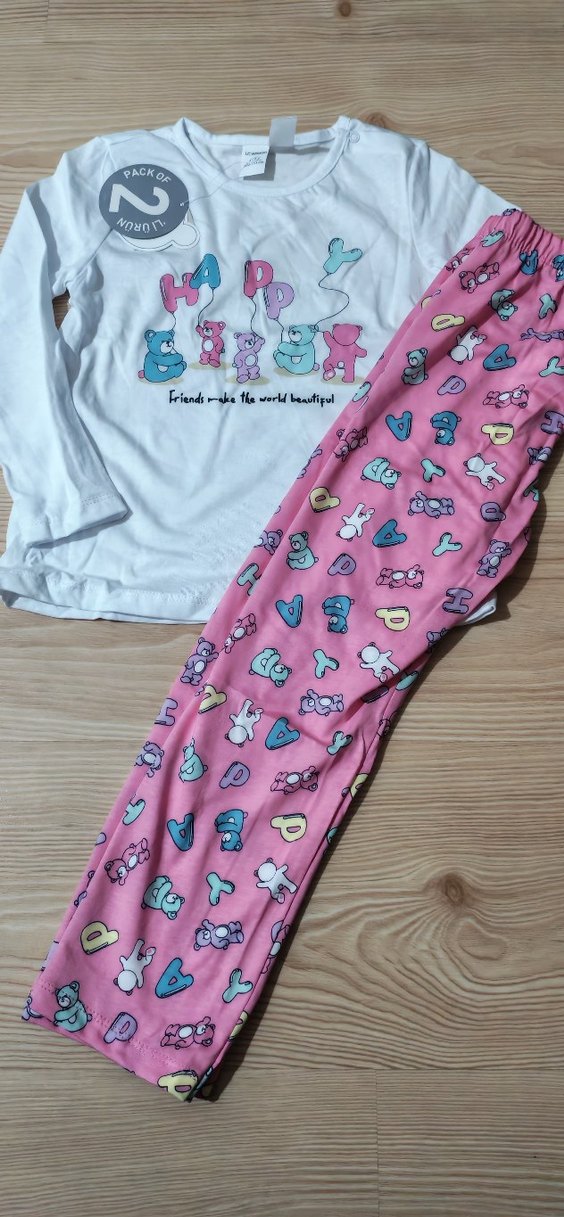Pamuklu, uzun kollu beyaz üstü renkli baskılı harf ve karakterler içerir. Pastel pembe baskılı pantolon ile tamamlanmıştır. Yuvarlak yaka rahatlığı sağlar. 4-5 yaş
