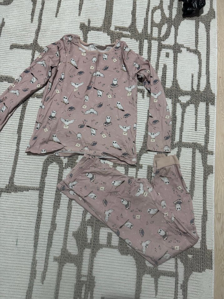 Pamuklu, uzun kollu, bisiklet yaka ve örme kumaştan yapılmış pembe pijama takımı, hayvan desenli.