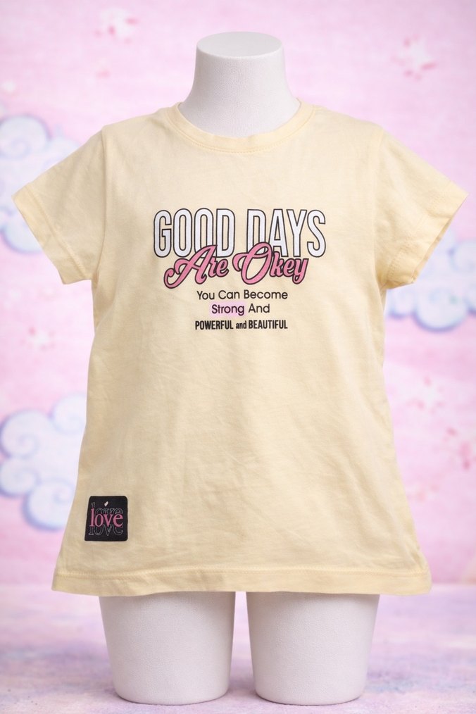 Pamuklu, kısa kollu, sarı renk kız çocuk tişörtü rahat kesimi ve bisiklet yaka tasarımıyla günlük kullanıma uygundur.