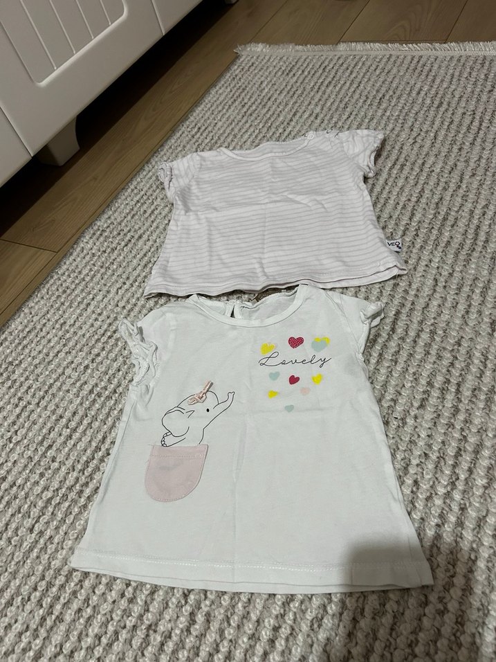 Yumuşak pamuktan, bol kesim kısa kollu iki bebek tişörtü. Biri pastel çizgili, diğeri baskılı ve kalpli küçük cepli . 12-18