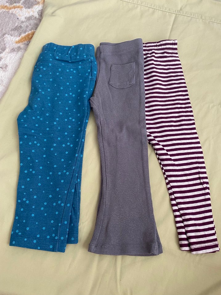 Yumuşak pamuklu triko kumaştan yapılmış, düz ve desenli tasarımlı, mavi ve gri tonlarında üç adet kız çocuk taytı seti.