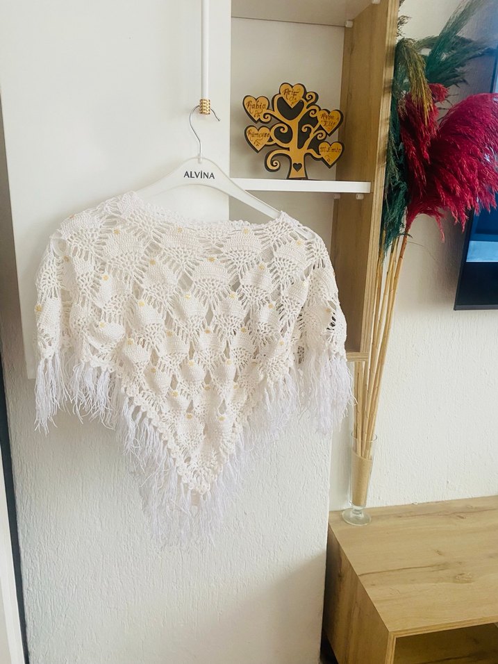püsküllü, beyaz örme bohem tarzda kız çocuk panço. El örgüsü pullu şık bir Panço. 4-8 yaş arası kullanılabilir. Dolabımdaki diğer ürünlerime de bakmanızı öneririm.