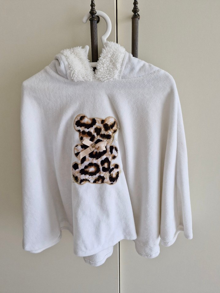 Yumuşak ve sıcak kumaştan, kapüşonlu beyaz kız çocuk panço önünde leopar desenli ayı baskısı bulunur. hic kullanilmadı 3 4 5 yasa uygun
