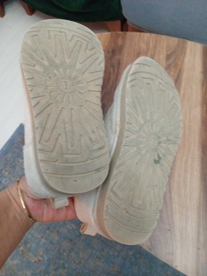 Kız çocuklar için beyaz renkli, sıcak tutan terlik. Kauçuk tabanlı ve Velcro bantlı. Pastel tonlarda sade tasarım.birinin önünde hafif açıklık var sorun deyil kullanma engel bir durumu yok