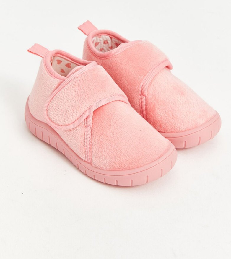 Kız çocukları için pastel pembe renkte, yumuşak ve sıcak kumaştan yapılmış terlikler. Düz tasarımlı, kolay giyilen cırt cırtlı kapanışa sahip.