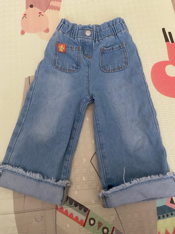 Kız çocukları için düğmeli, cep detaylı, bol kesim mavi denim pantolon. Paçalar kıvrık ve kenarları tırtıklı, rahat bir sokak stili sunar.