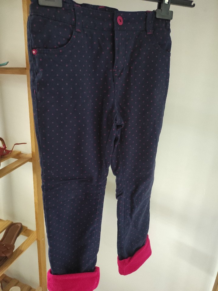 Kız çocukları için düğmeli, beli lastikli.. lacivert üzerine pembe puantiyeli içi polar kışlık pantolon. 8-9 yaş uyumlu..
