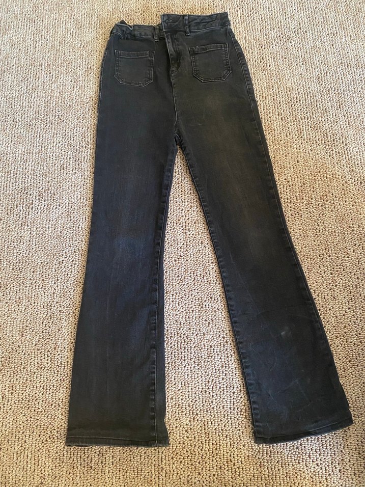 Bu siyah kot pantolon, normal midi boyda, oturan kesime ve tokalı detaya sahip, günlük rahat kullanıma uygundur. 13/14 yaş çok az giyildi