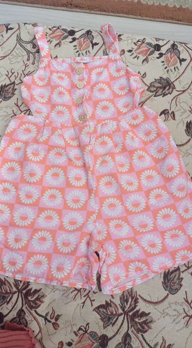 Düğmeli, askılı ve bol kesim kız çocuk tulumu. Pastel pembe papatya desenli, yumuşak sentetik kumaştan üretilmiştir.