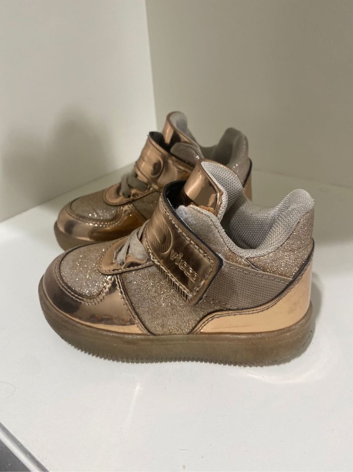Cırt cırtlı, parlak altın renk kız çocuk spor ayakkabısı, kauçuk tabanlı, sokak modasına uygun.