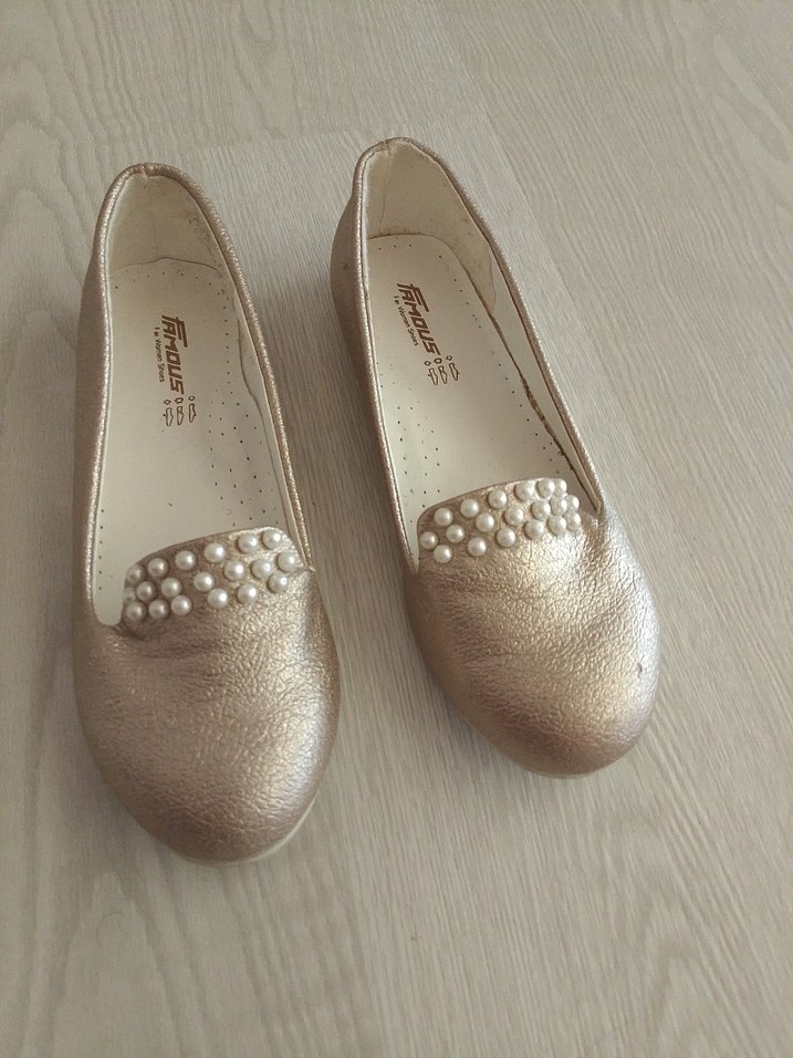 Kız çocukları için parlak altın renkli, düğmeli detaylı babet ayakkabı. Kauçuk malzemeden yapılmıştır, desensiz ve klasik görünümlüdür.numarasi silindi 35 uyumludur.