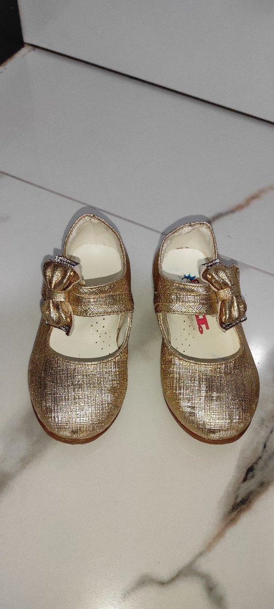 Kız çocukları için parlak altın renkte, tokalı kayışlı ve hafif yılan desenli kauçuk babetler. Geleneksel ve biraz eski tarzda.