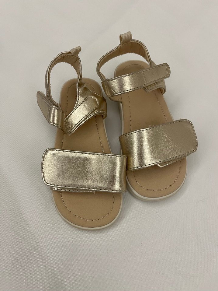 Parlak altın renkte, tokalı kayışlara sahip kız çocuk sandaletleri, rahat kauçuk tabanlıdır. Temel ve sade tarzlar için uygundur. Hiç kullanılmadı etiketi yok.