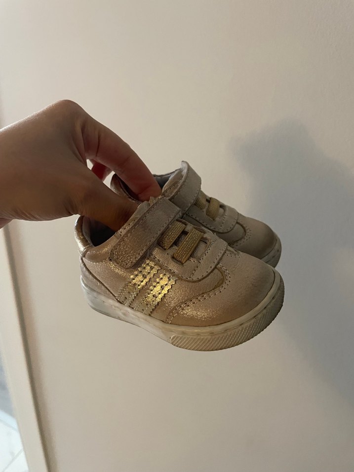 Parlak altın yılan deseniyle kız çocukları için tasarlanmış, cırt cırt bantlı ve kauçuk tabanlı spor ayakkabılar.